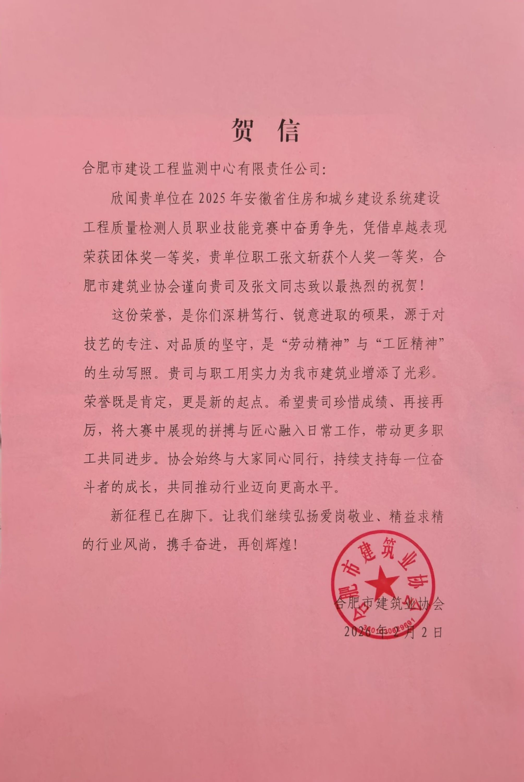近日,合肥市建设工程监测中心有限责任公司收到合肥市建筑业协会和合肥市包河区住房和城乡建设局两份表彰,两份表彰均对监测中心在2025年度安徽省住房和城乡建设系统建设工程质量检测人员技能竞赛中取得的成绩予以高度认可。 2025年安徽省住房和城乡建设系统建设工程质量检测人员技能竞赛由安徽省住房和城乡建设厅、安徽省总工会联合主办,安徽省建设建材工会、安徽省建设工程质量与安全协会、合肥市城乡建设局承办,是建设系统建设工程质量检测人员展现劳模精神、劳动精神、工匠精神的良好平台,是全面贯彻党的二十大和二十届二中、三中全会精神,深入贯彻习近平总书记考察安徽重要讲话精神的具体行动。 两份表彰均希望受到表彰的单位和个人珍惜成绩、再接再厉,将比赛中展现的拼搏与匠心融入日常工作,发挥引领示范作用,带动更多职工共同进步,推动建设工程质量检测高质量发展。 两份表彰的获得既是对已获成绩的肯定,也是奋斗的起点。公司将一如既往的扎根技术、锻炼本领、培养技术人才,为行业发展发挥示范作用。