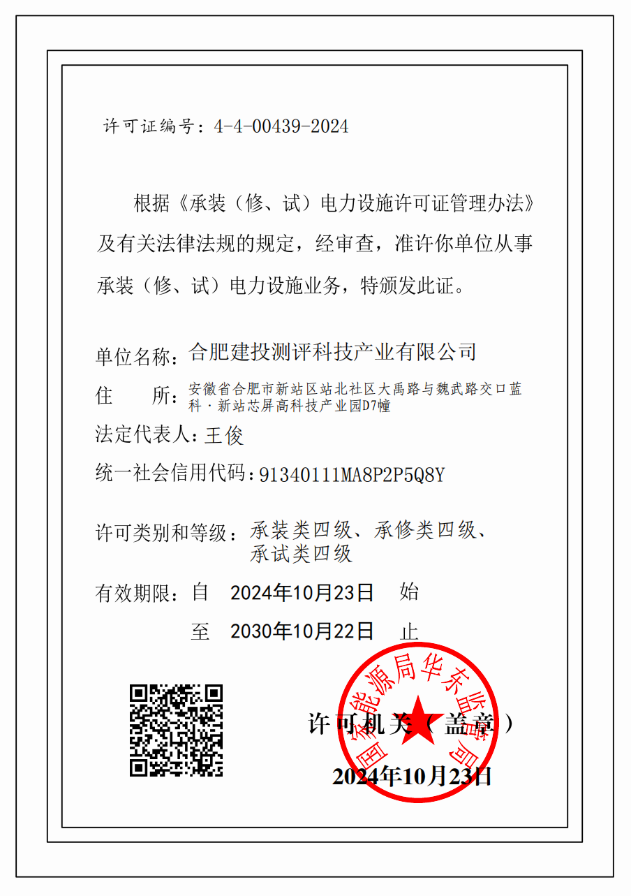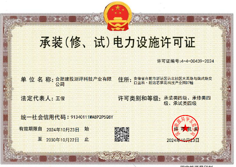 11月25日,监测中心控股子公司建投测评获批电梯安装(含修理)A2级资质的特种设备生产许可证。至此,监测中心2024年度建筑全生命周期检测技术拓展工作已全部完成。随着该项许可的获批,合肥建投测评已具备电梯、消防、电力等方面技术服务的资质和能力: