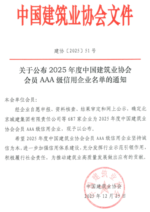 日前,中国建筑业协会公布2025年度中国建筑业协会会员AAA级信用企业名单,合肥市建投集团所属企业合肥市建设工程监测中心有限责任公司再度榜上有名。